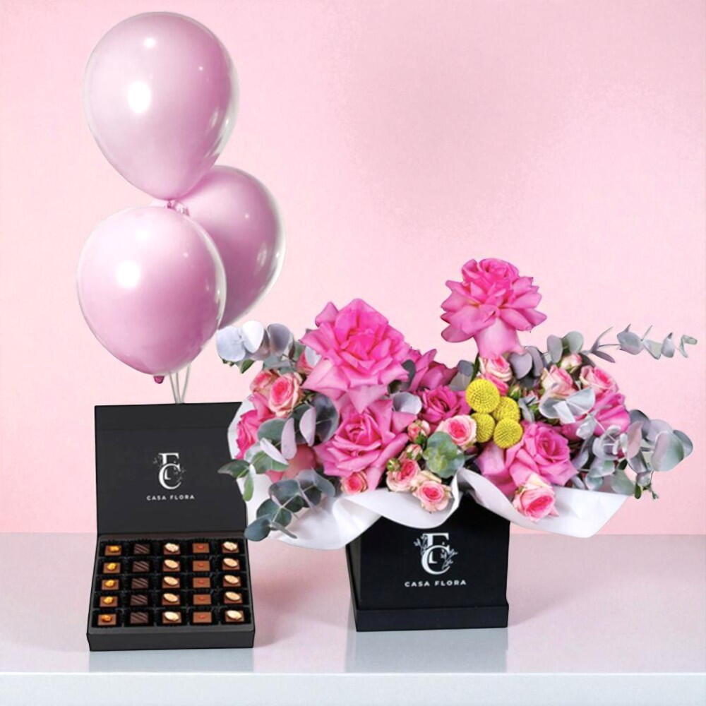 Inside a sleek, black CASA FLORA box, this floral arrangement features a charming mix of pink roses, cheerful yellow blossoms, and lush greenery. Accompanied by a box of decadent chocolates and three playful pink balloons, this delightful ensemble is perfect for celebrating special moments and spreading joy. The combination of colors, textures, and treats creates a memorable and heartwarming gift.