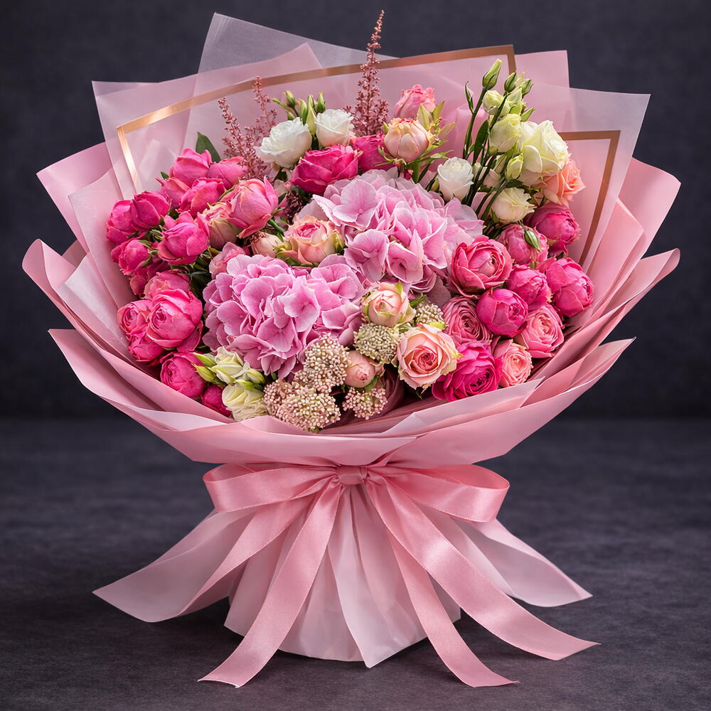 The Pink Elegance Hydrangea Bouquet is a graceful and luxurious floral arrangement designed to capture beauty, softness, and sophistication. This stunning bouquet features lush pink hydrangeas surrounded by a delicate mix of premium pink roses, spray roses, and soft seasonal blooms, creating a rich and romantic garden-style arrangement.