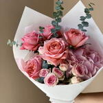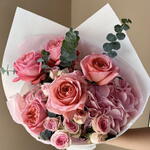 rose pink expression - 5 pcs spray rose dinara - 3 pcs wrapping m - 1 pcs leaf eucalyptus spray baby blue - 2 pcs hydrangea bloom pink - 1 pcs