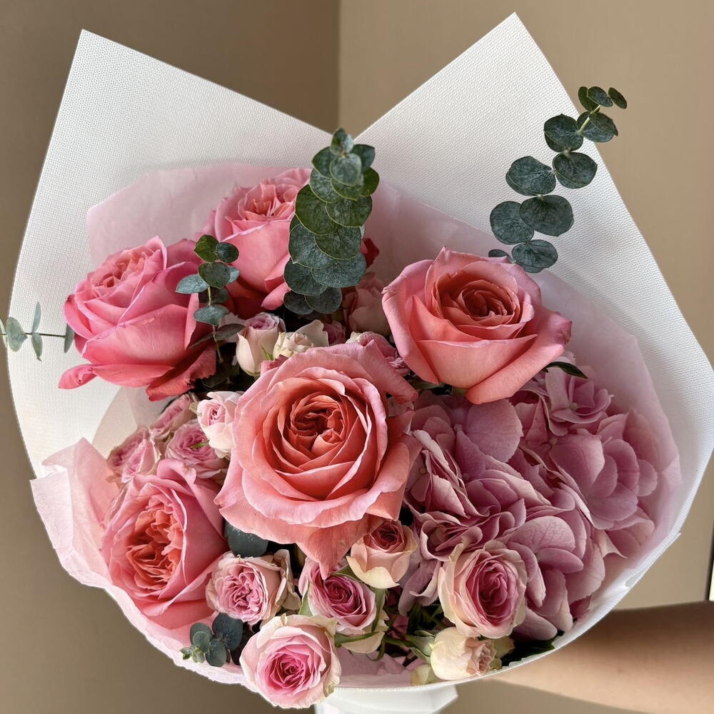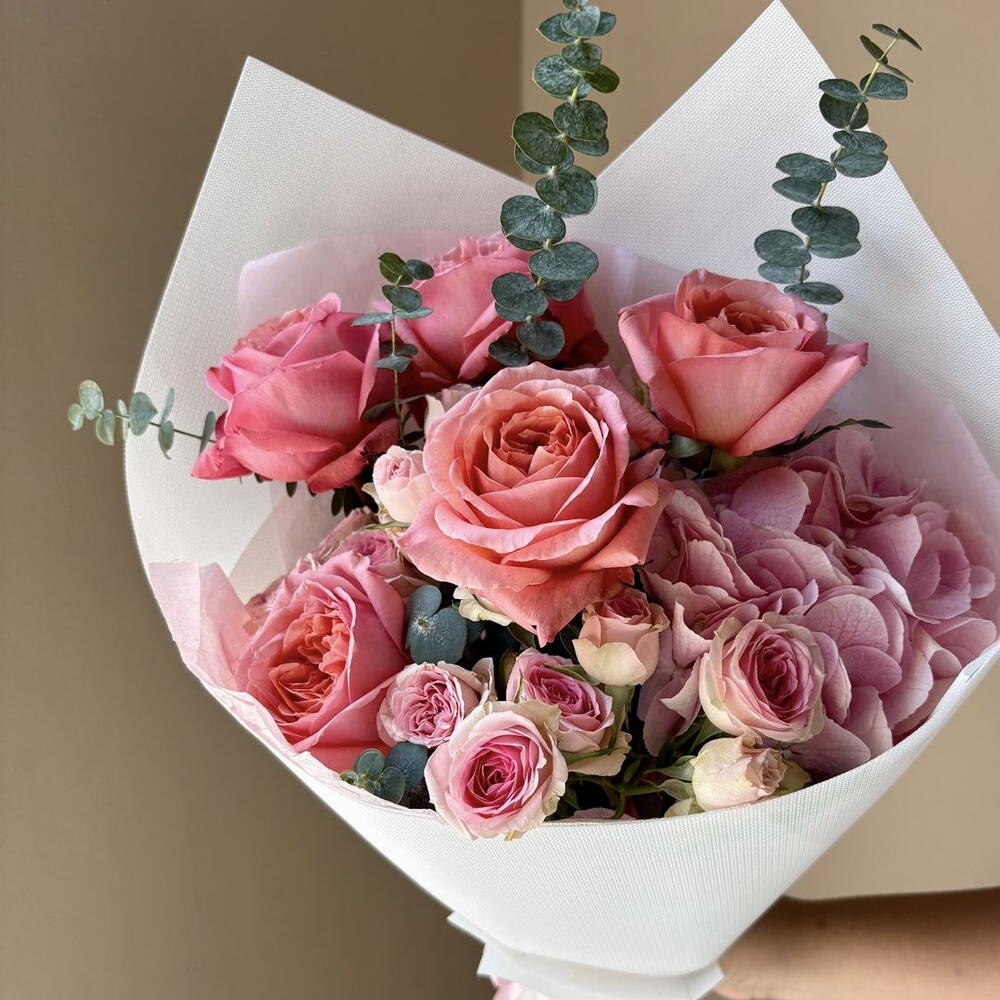 rose pink expression - 5 pcs spray rose dinara - 3 pcs wrapping m - 1 pcs leaf eucalyptus spray baby blue - 2 pcs hydrangea bloom pink - 1 pcs
