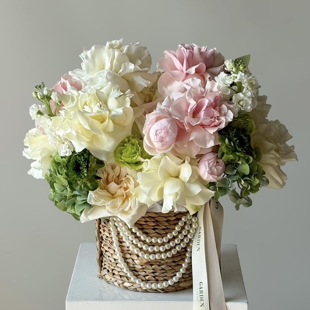 Our bestseller of green, white and pink blooms, accented with elegant pearl details — a stylish choice for special occasions or a refined gift. Includes hydrangea, freesia, matthiola, Moonstone rose, O’hara rose, Peony Pink rose. The set comes with a personalized card, care instructions and flower fertilizer. *Flower delivery today Perfect for: - a gift for her; - weddings or anniversaries; - birthday; - gift add-ons; - gifts with no occasion; - VIP events or luxury floral surprise.
