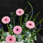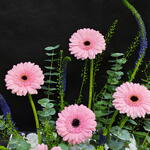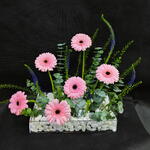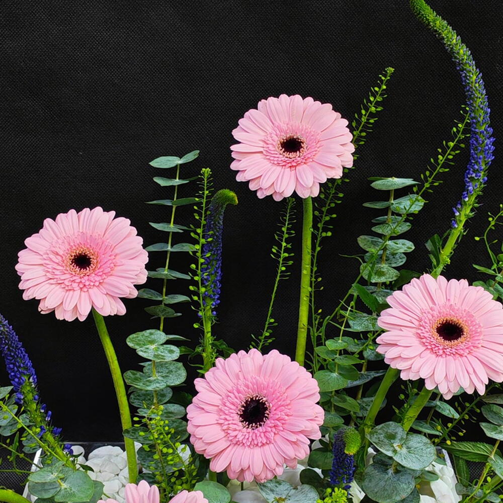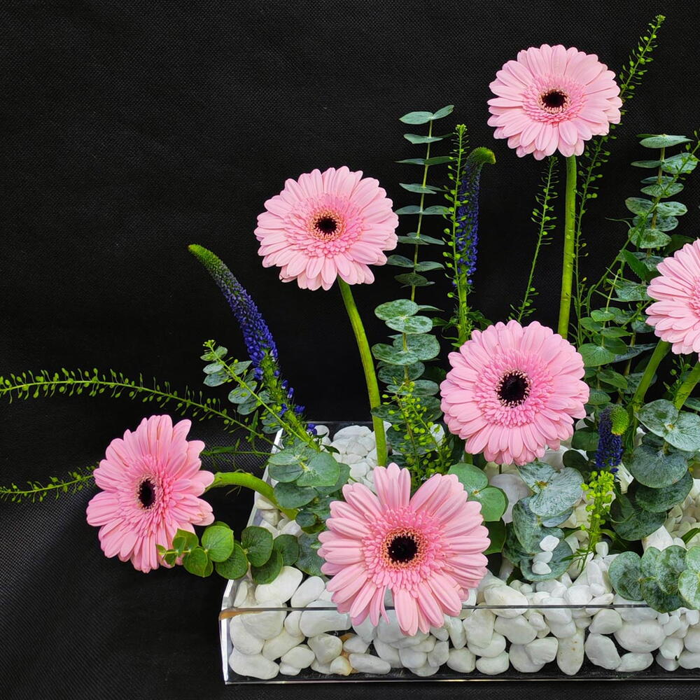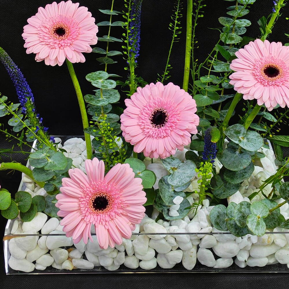 A stunning modern floral arrangement featuring radiant Gerbera daisies beautifully paired with lush greenery and accents of blue veronica. Arranged in a sleek rectangular vase filled with white stones, this design perfectly blends elegance and freshness — ideal for brightening up any space or gifting on special occasions.💞🌸💮🏵️🌼 ##############Trending#####