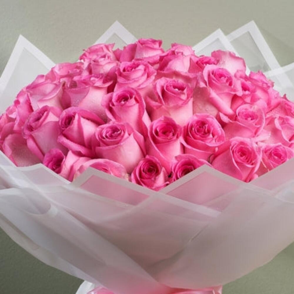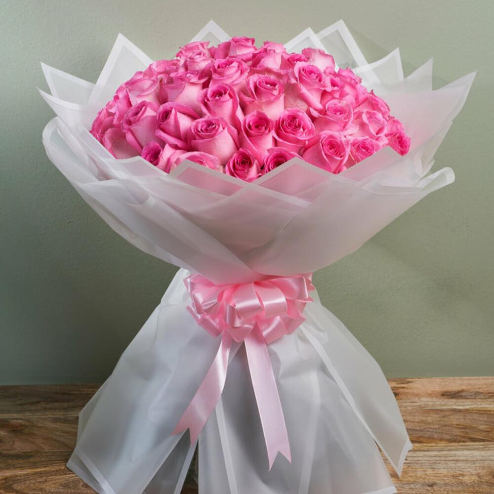Indulge in a symphony of color with this stunning mono bouquet, meticulously composed of 51 exuberant pink roses. Carefully selected for their exquisite hue and pristine bloom, these spectacular roses symbolize gratitude, grace, and admiration, making them the perfect gift for any occasion. Bring elegance, sweetness, and an influx of positive emotion into any space with this splendid bouquet.