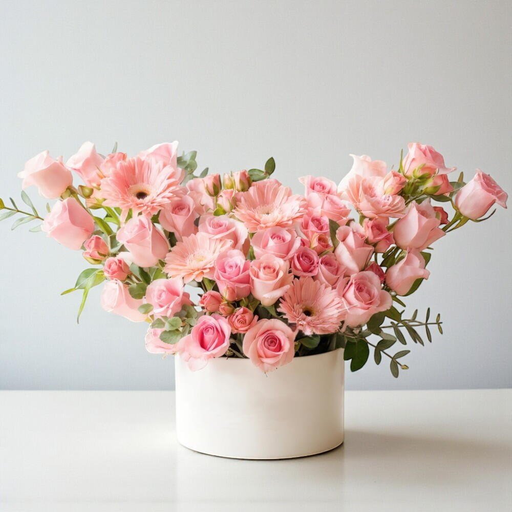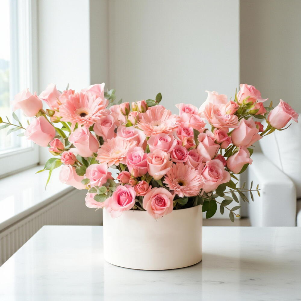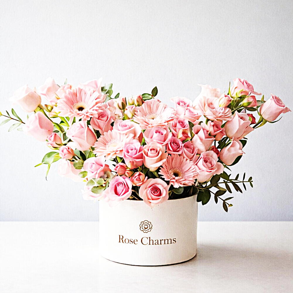 A stunning blend of soft pink roses and gerberas, the Pink Harmony Flower Box is crafted to express elegance, affection, and feminine beauty. Set in a premium white ceramic box, this arrangement brings together romantic tones, lush textures, and timeless charm. Perfect for birthdays, anniversaries, love celebrations, baby girl gifts, or simply brightening someone’s day with beautiful pink blooms. Includes: ✓ Premium soft pink roses 20 ✓ Pink gerbera daisies-3 ✓ Spray roses greenery ✓ White flower box ✓ Handcrafted by Rose Charms A luxurious pink statement piece that fills any room with warmth and grace. “Celebrate love and elegance, send this luxury pink box today.”