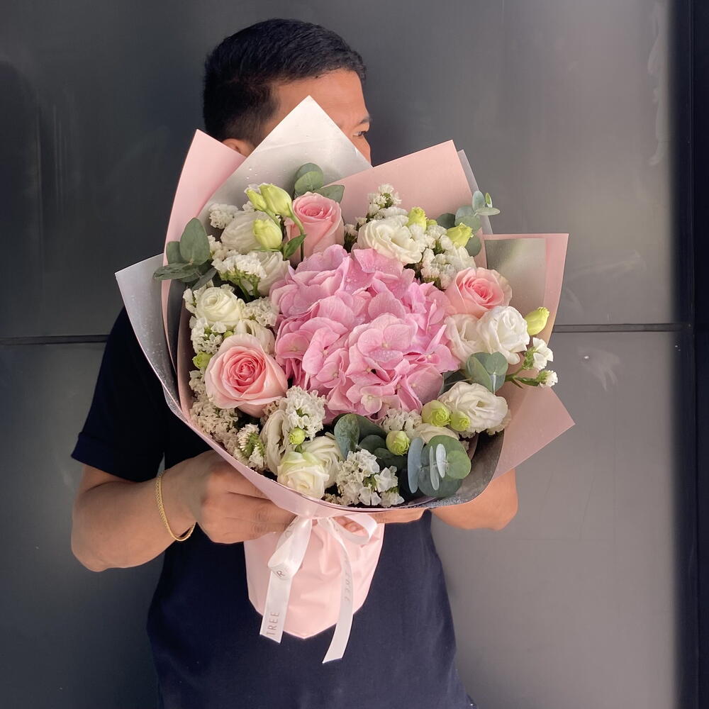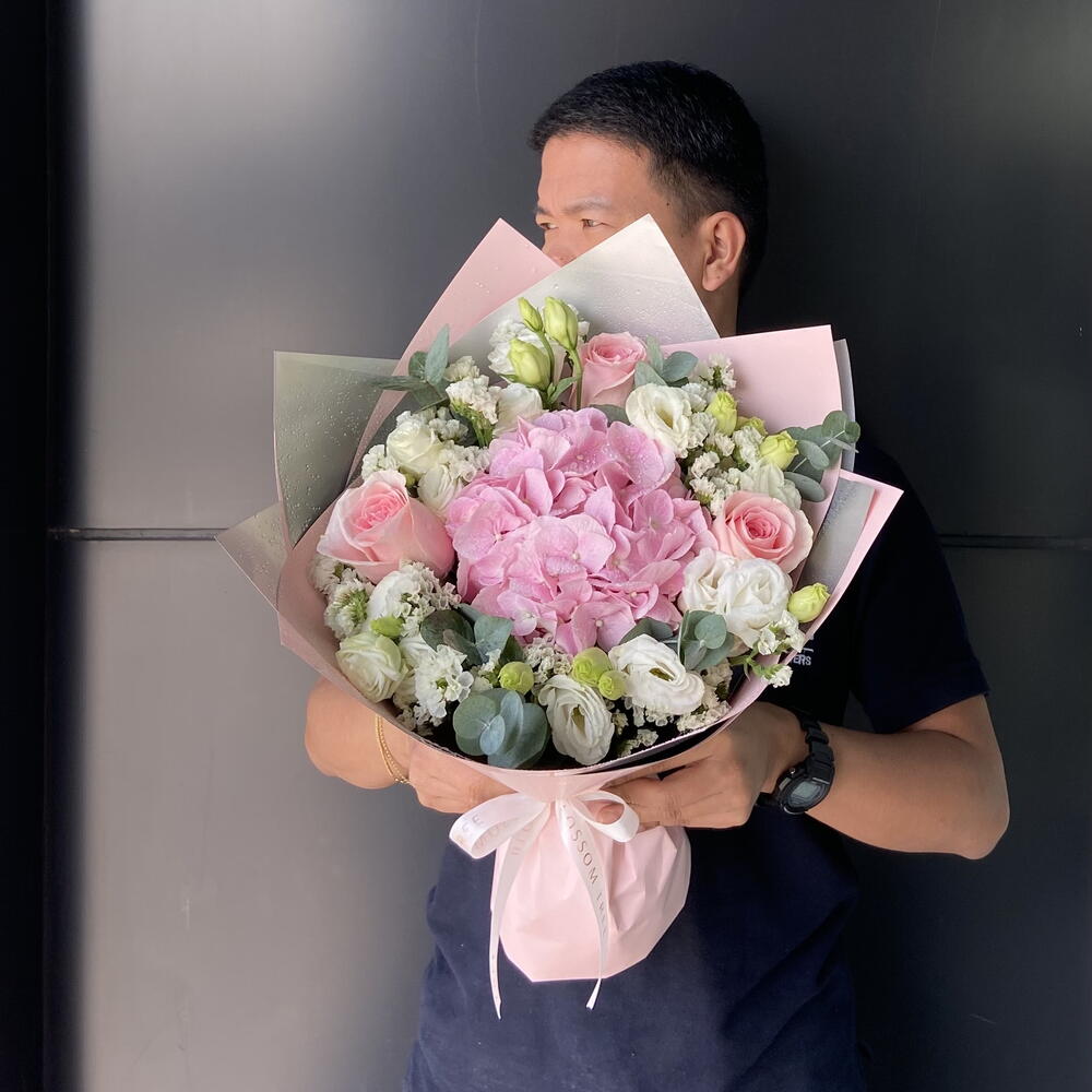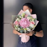 Statice - 3 pcs Eucalyptus - 3 pcs Pink rose - 3 pcs Lisianthus - 5 pcs pink hydrangea - 1 pcs