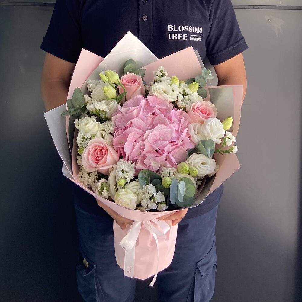 Pink Harmony | Hydrangea | Pink Roses | Lisianthus | Pink and White Bouquet