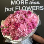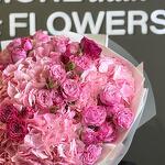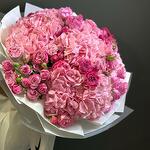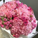 This stunning hand-tied bouquet is a celebration of all things pink. It is a dense, voluminous arrangement with a beautiful variety of textures and shades. The bouquets main components are large, soft pink hydrangeas and a mix of roses, including both classic full-bloom roses and delicate spray roses in varying shades of light to hot pink. The overall effect is one of abundance, romance, and charm, making it an ideal gift for an anniversary, birthday, or as a gesture of love and admiration. The bouquet is expertly wrapped in white and clear cellophane with white ribbon, highlighting the natural beauty of the blooms.
