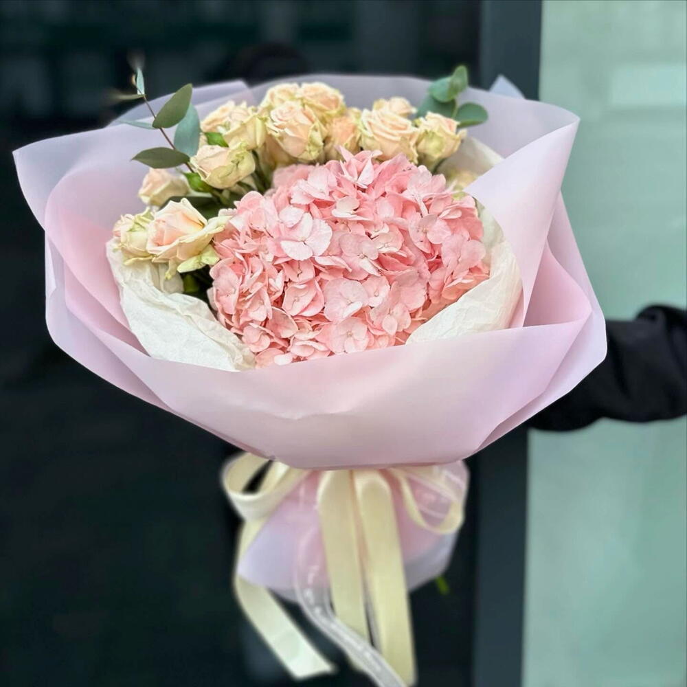 PINK HYDRANGIA 2 SPERY PECH ROSES 3 EUCALEY IN A BQT 150 AED