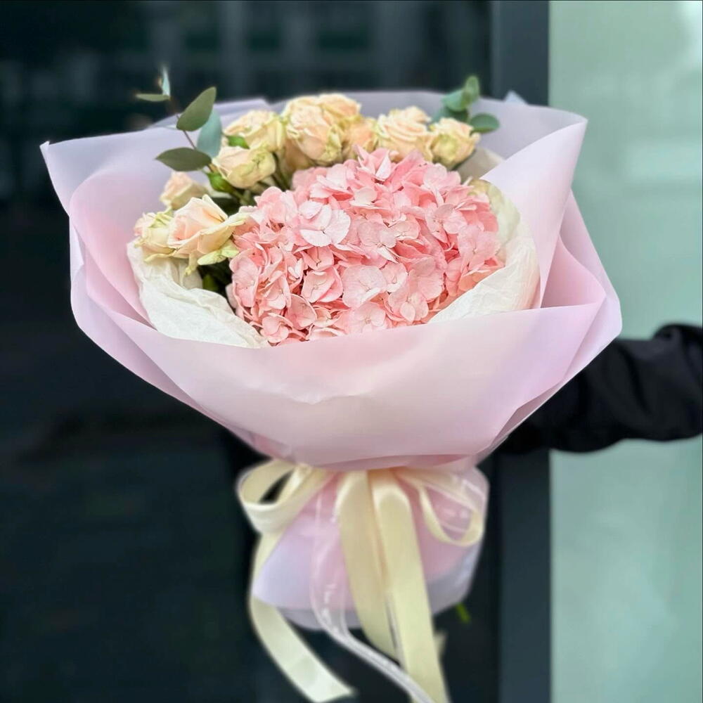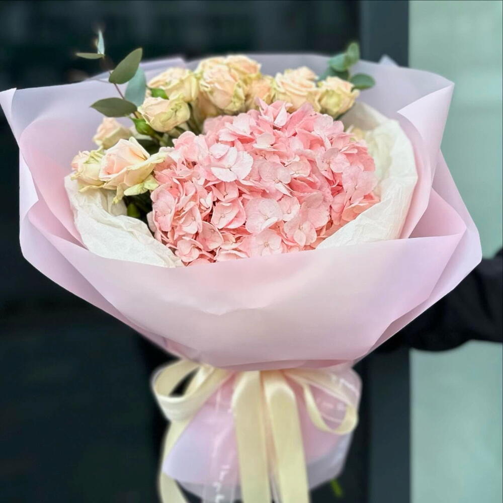 pink hydrangia - 2 pcs spery pech roses - 3 pcs eucaley in a bqt - 2 pcs