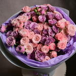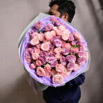 Ribbon - 1 pcs wrapping paper - 5 pcs purple spray roses - 10 pcs pink madam bombastic roses - 11 pcs