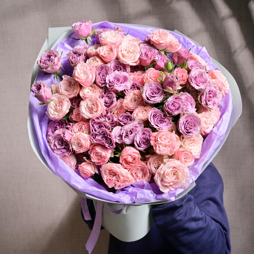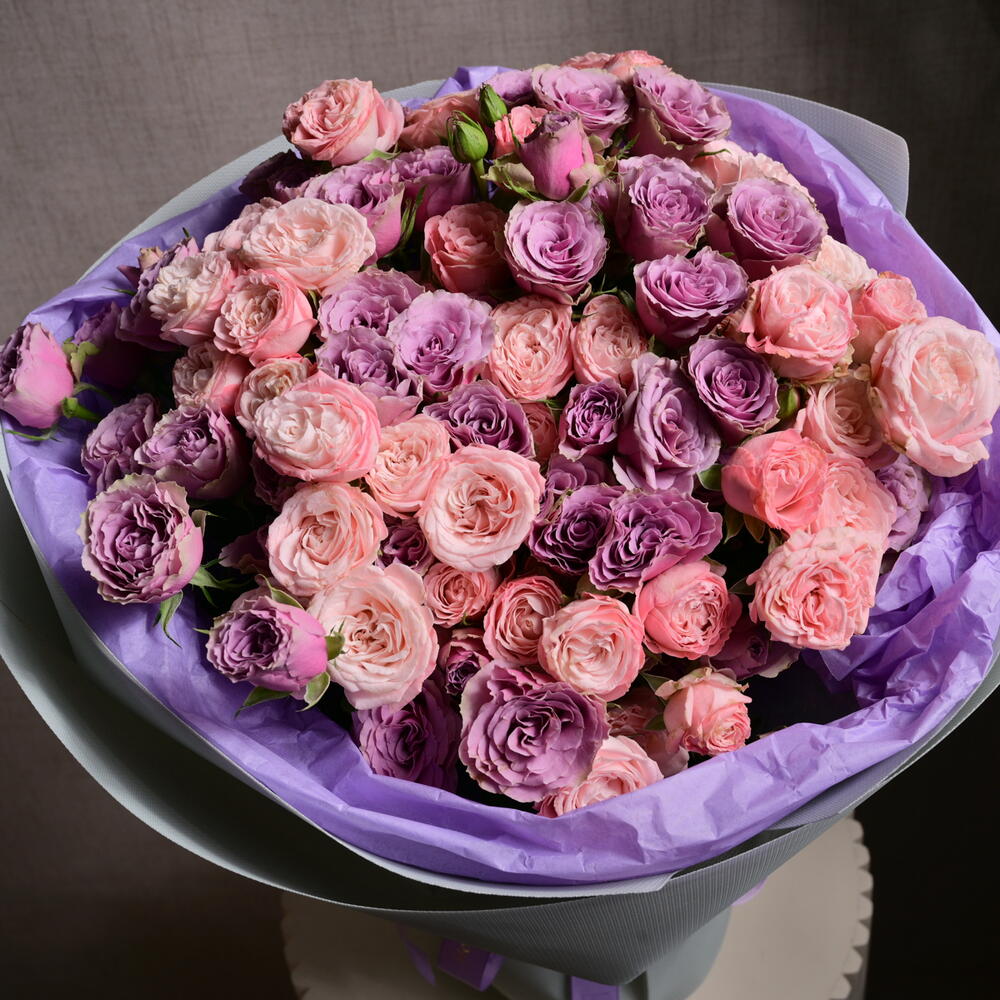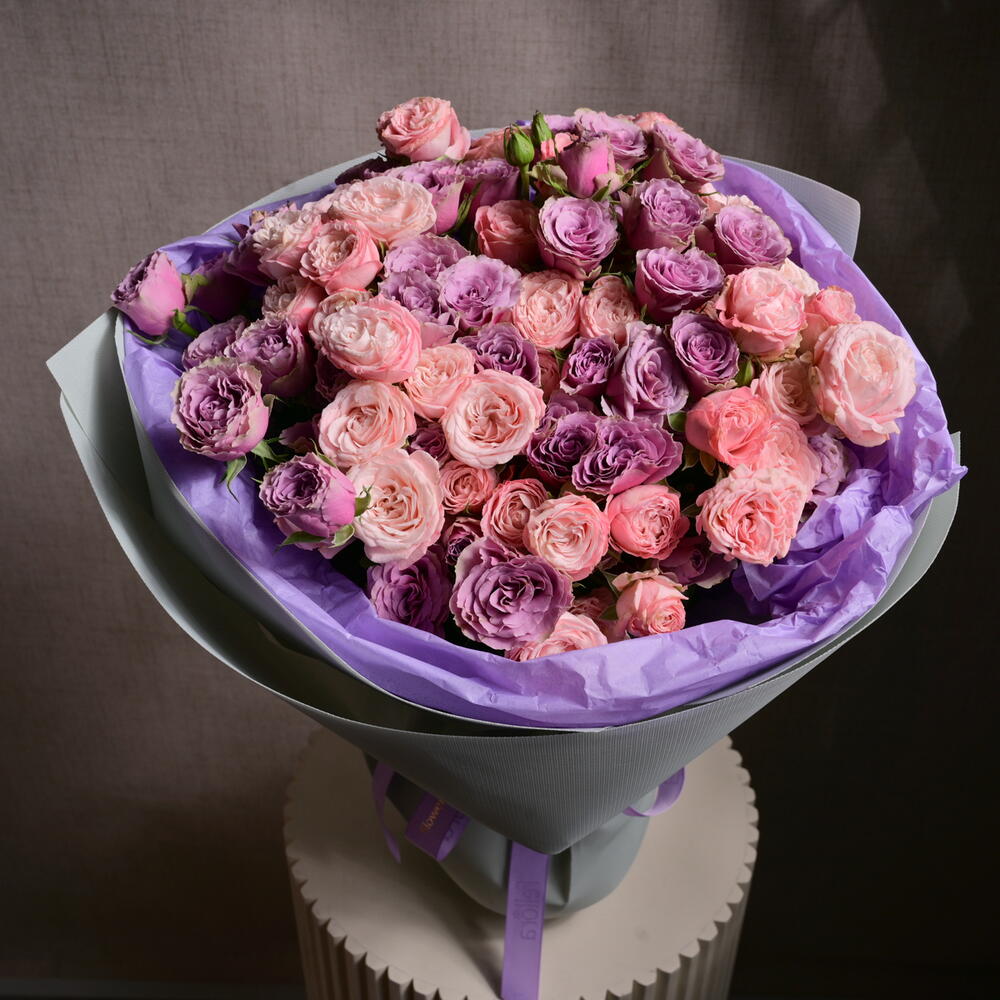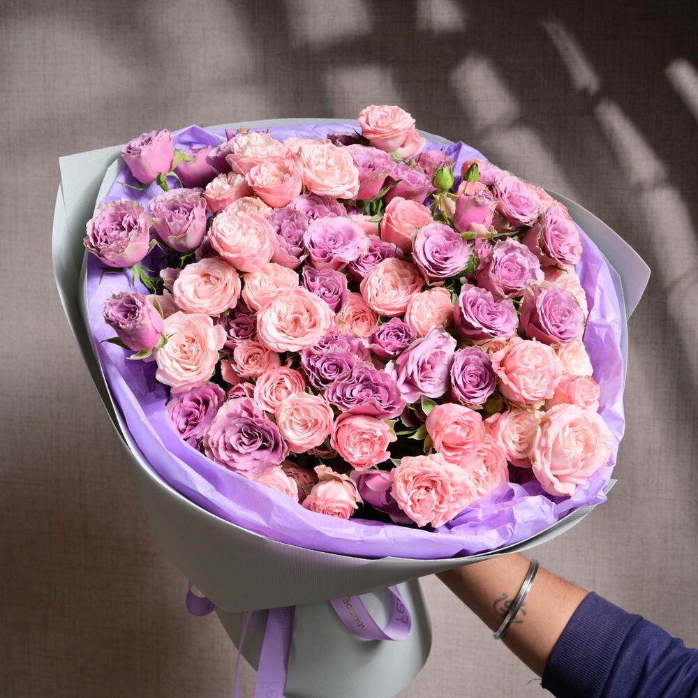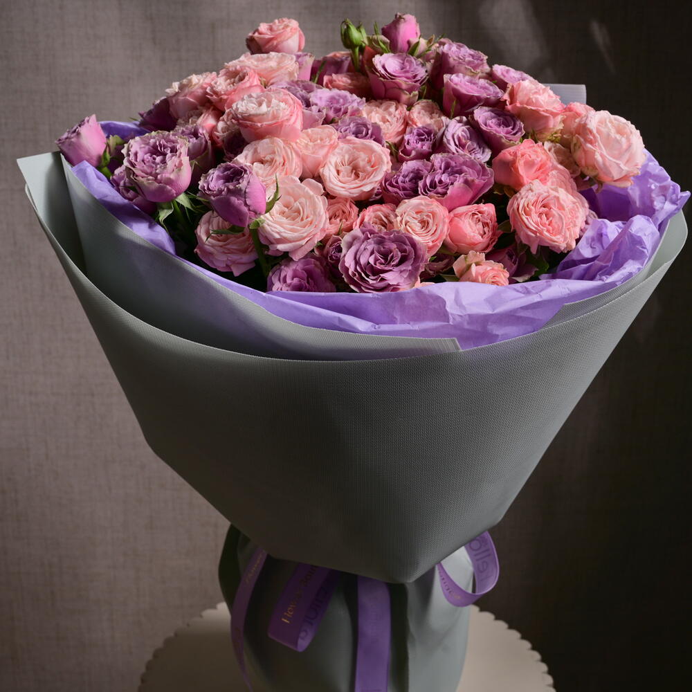 Ribbon - 1 pcs wrapping paper - 5 pcs purple spray roses - 10 pcs pink madam bombastic roses - 11 pcs