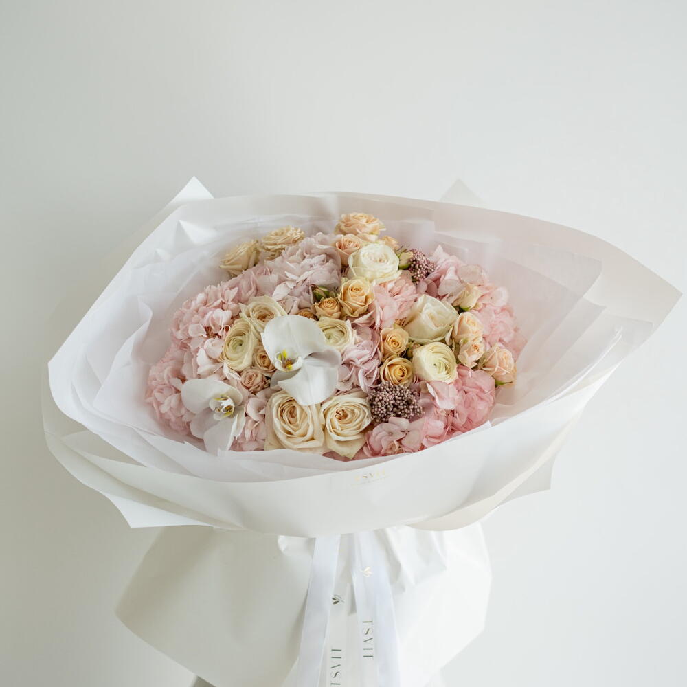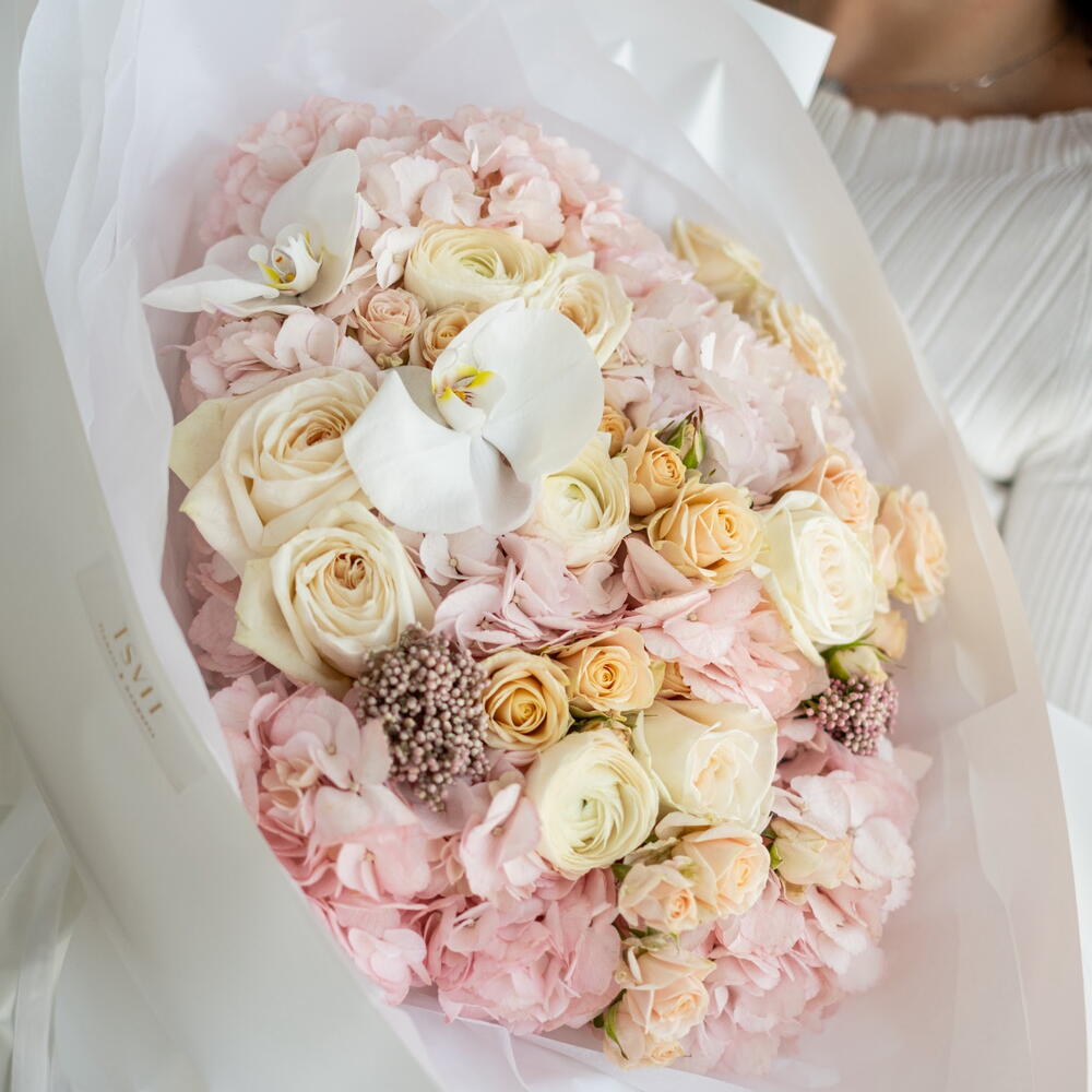 Hydrangea - 8 pcs ranunculus - 3 pcs bombastic rose - 5 pcs phalaenopsis orchid - 2 pcs ozothamnus - 3 pcs ohara rose - 5 pcs
