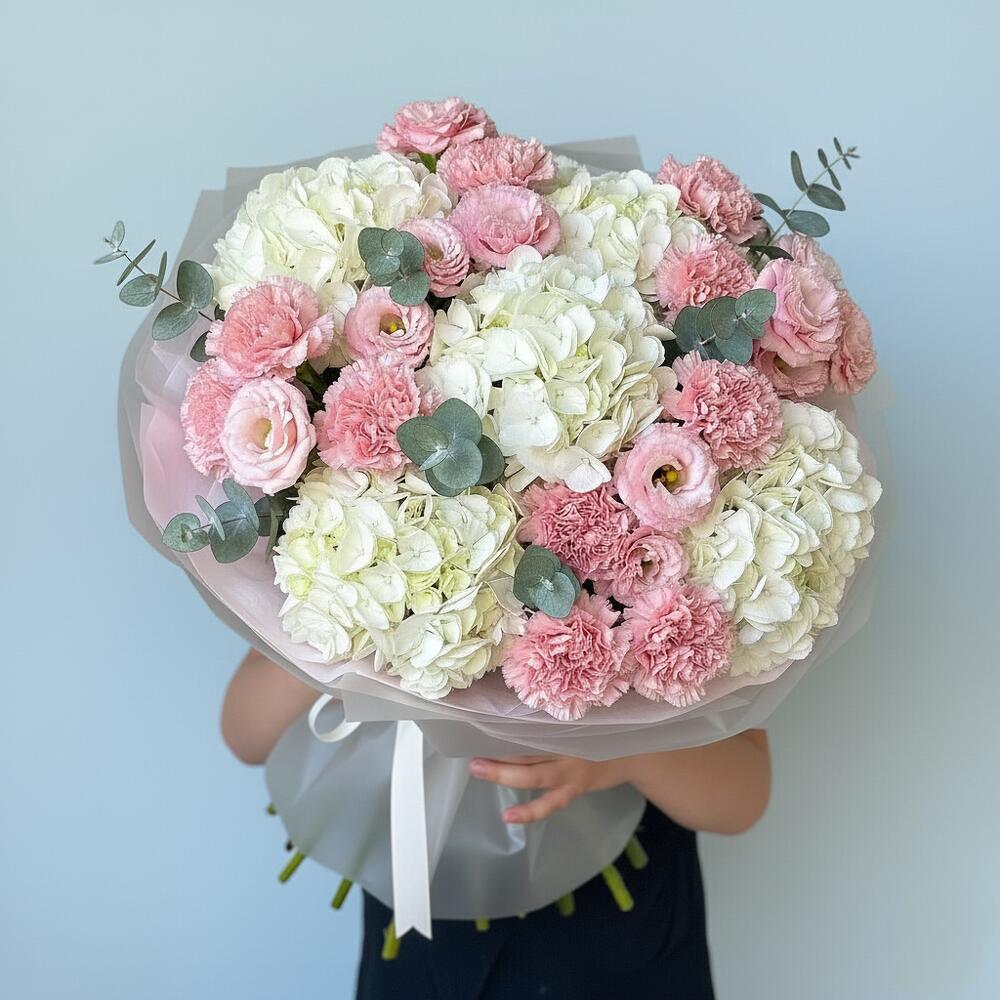 A soft and dreamy bouquet that captures the beauty of gentle elegance. Featuring lush white hydrangeas, delicate pink carnations, and graceful lisianthus, all tied together with a fresh touch of eucalyptus, this arrangement radiates tenderness and charm. Perfect for expressing love, gratitude, or simply brightening someone’s day with a cloud of pastel bliss.