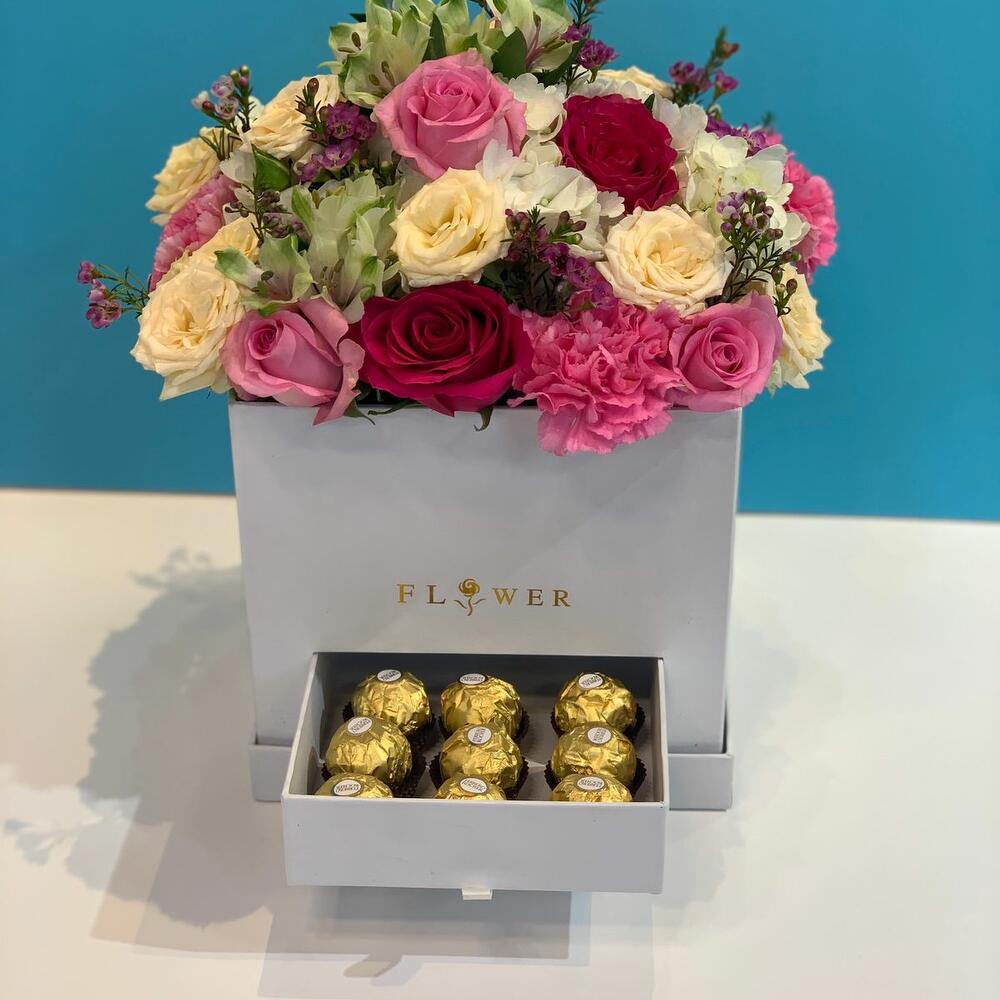PINK MIX FLOWER & CHOCOLATE 9 PCS IN BOX ARANGEMANT