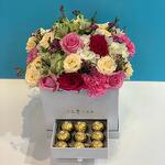 Box - 1 pcs Chocolate - 9 pcs carnation - 8 pcs caspia - 3 pcs wax - 3 pcs pink mix rose - 20 pcs