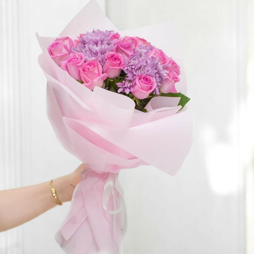 The Pink Moon Bouquet is a captivating arrangement that blends soft romance with striking elegance. Featuring 10 premium pink roses paired with 10 lush purple chrysanthemums, this bouquet creates a dreamy contrast that is perfect for birthdays, anniversaries, or any celebration of love and admiration. Wrapped in delicate pastel pink paper, it exudes grace and femininity, making it a thoughtful gift that will brighten anyone’s day. Care Recommendations: To keep your Pink Moon Bouquet fresh and vibrant, trim the stems at an angle and place them in a clean vase filled with cool, fresh water. Keep the bouquet away from direct sunlight, heating vents, and drafts. Change the water every two days and remove any wilted petals or leaves to prolong the beauty and life of the flowers.