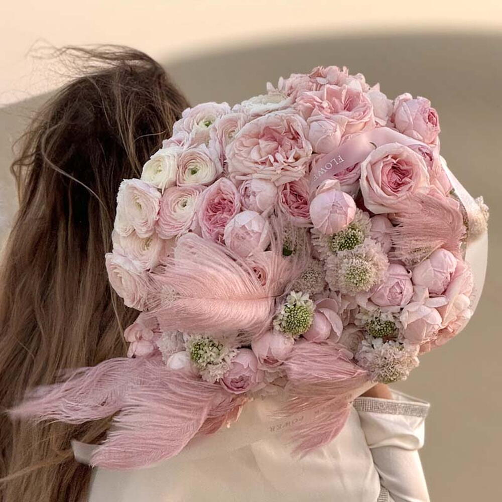 Hydrangea - 7 pcs rose ohara - 25 pcs rose peony pink - 12 pcs ranunculus - 10 pcs