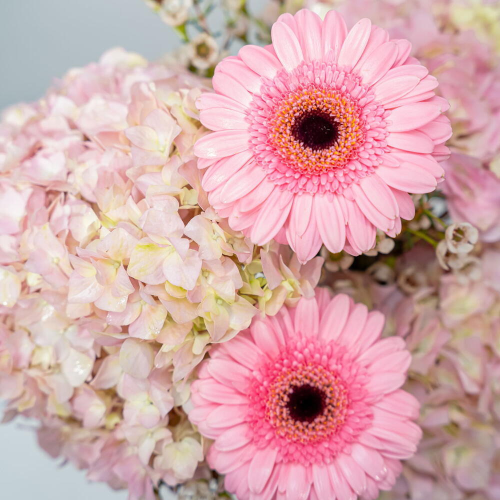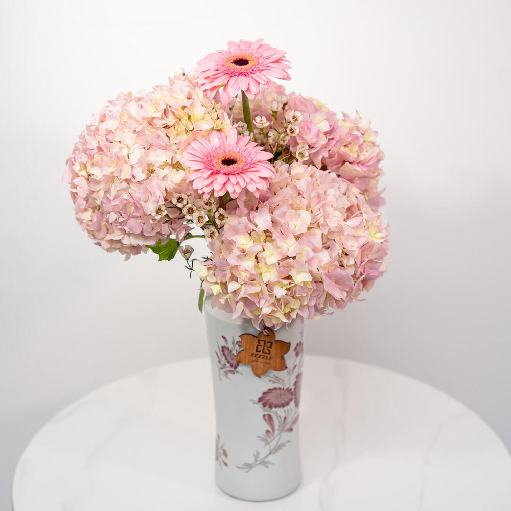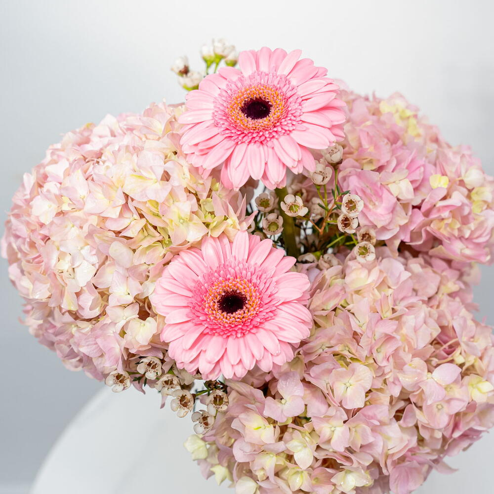 Pink Paradise: A Vision of Rosy Elegance A soft and romantic vase, Pink Paradise features 3 lush pink hydrangeas and 2 vibrant pink gerberas, beautifully arranged in a ceramic vase. This harmonious arrangement exudes elegance and femininity. The combination of the large, fluffy hydrangeas and the cheerful gerberas creates a stunning and uplifting display. Embrace the Gentle Charm of Pink