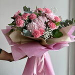 Eucalyptus - 5 pcs Alstroemeria - 4 pcs Gypsophila - 4 pcs pink carnations - 21 pcs pink hydrangea - 4 pcs fillers - 5 pcs