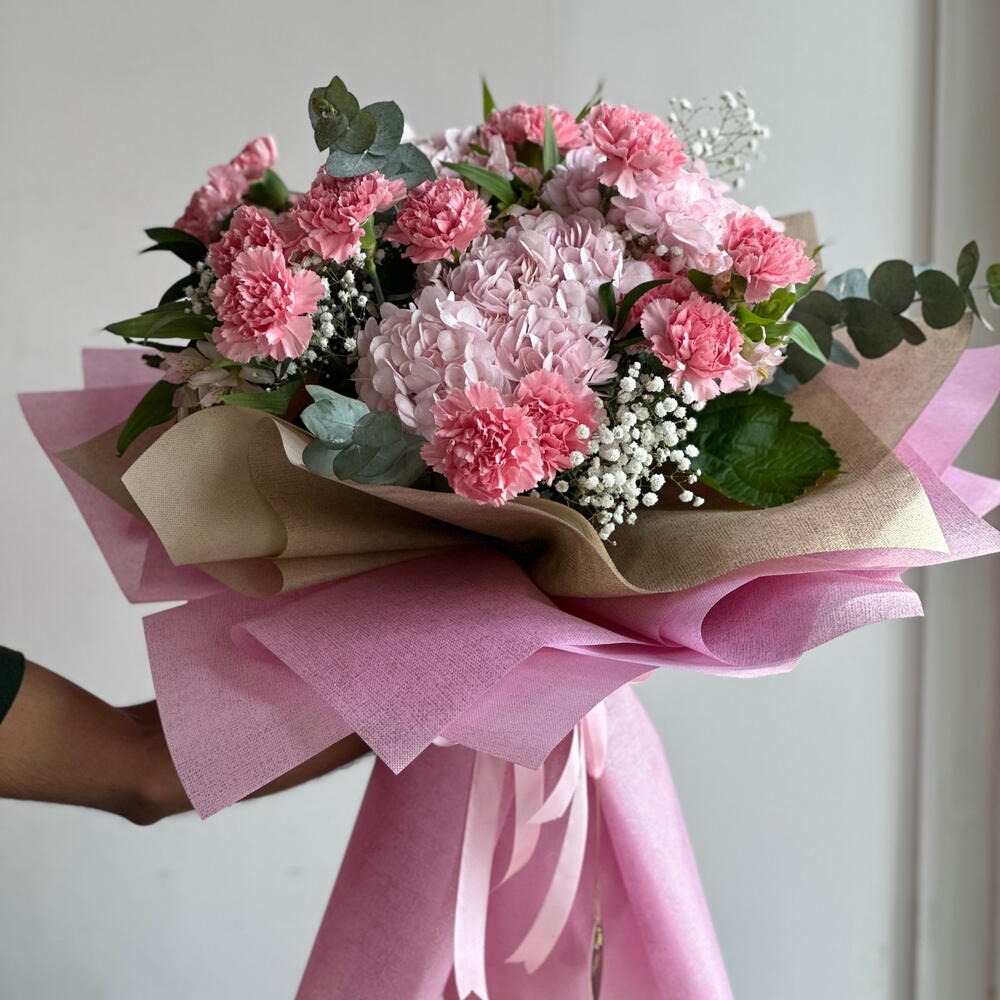 Soft, graceful, and effortlessly elegant. This charming bouquet features 21 blush pink carnations, 4 lush pink hydrangeas, and 4 delicate white alstroemerias, thoughtfully accented with fresh eucalyptus foliage. Wrapped in gentle pink and natural tones, the arrangement feels romantic, full, and beautifully balanced. Perfect for birthdays, heartfelt thank-yous, celebrations, or simply sharing affection, this bouquet delivers warmth and tenderness in every detail. Carefully handcrafted to delight at first sight, it brings a calm, refined beauty that suits any moment worth remembering.