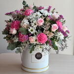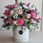 Box - 1 pcs Pink rose - 15 pcs pink carnations - 10 pcs pink alstroemeria - 3 pcs white chrysanthemum - 5 pcs fillers mix - 10 pcs