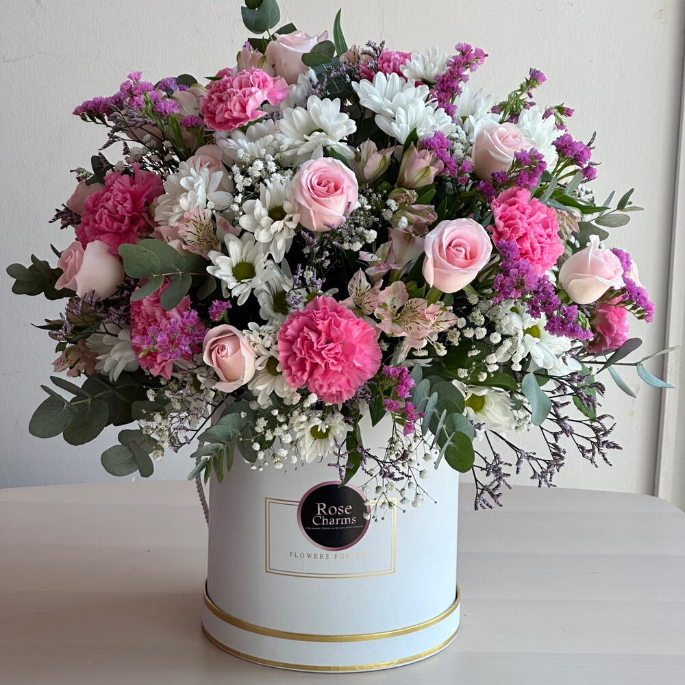 Delight in the beauty of the Charming Box Arrangement, a graceful display featuring 10 delicate pink carnations, 15 soft pink roses, and 5 pristine white chrysanthemums. Accentuated with 3 elegant pink alstroemerias and lush fillers, each bloom adds its own unique charm, blending in perfect harmony. Presented in a stylish box, this arrangement radiates grace, warmth, and elegance, making it the perfect gift for birthdays, anniversaries, Women’s Day, or any heartfelt occasion. ✨ Celebrate love and elegance in bloom. Order the Charming Box Arrangement today for same-day delivery and surprise your loved ones with timeless beauty.