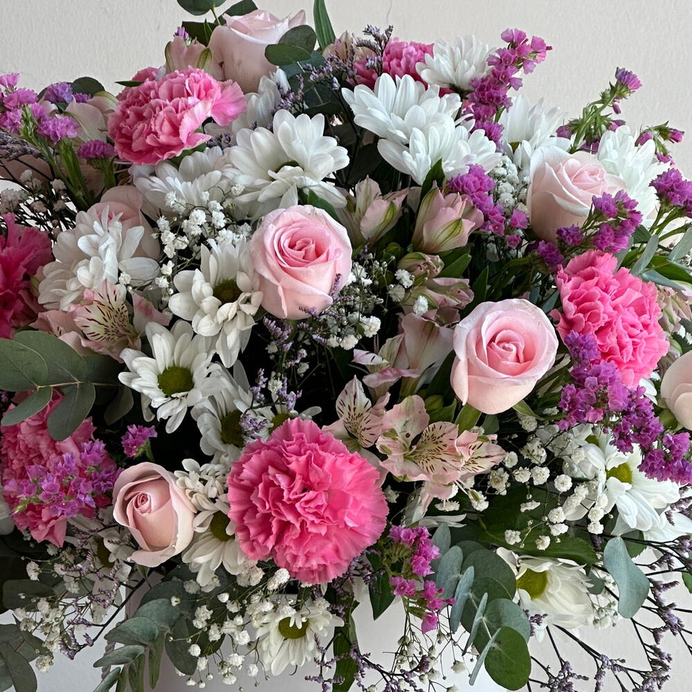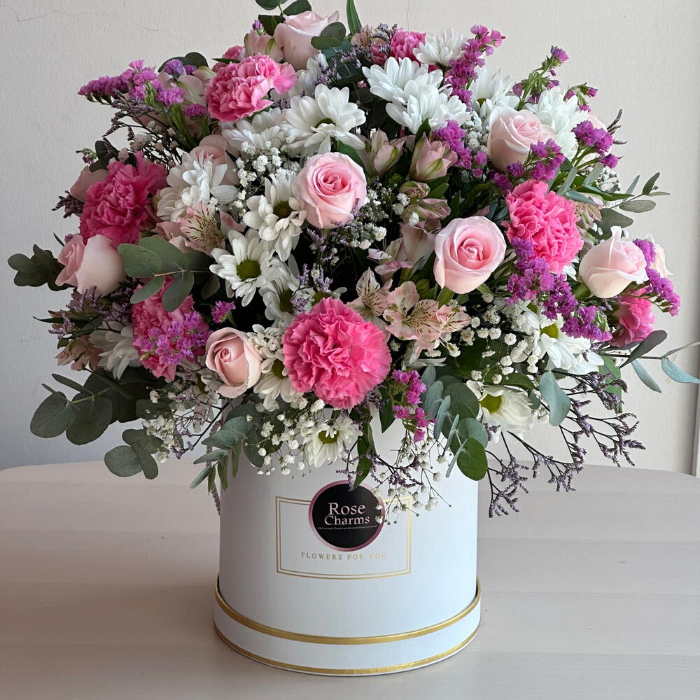 Box - 1 pcs Pink rose - 15 pcs pink carnations - 10 pcs pink alstroemeria - 3 pcs white chrysanthemum - 5 pcs fillers mix - 10 pcs