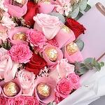 rose light pink - 4 pcs cinerea eucalyptus filler - 2 pcs white gypsophillia filler - 3 pcs light pink mathiola - 4 pcs 5 red rose - 5 pcs ferraro rocher single 12 pc - 12 pcs pink rose fushsia - 5 pcs