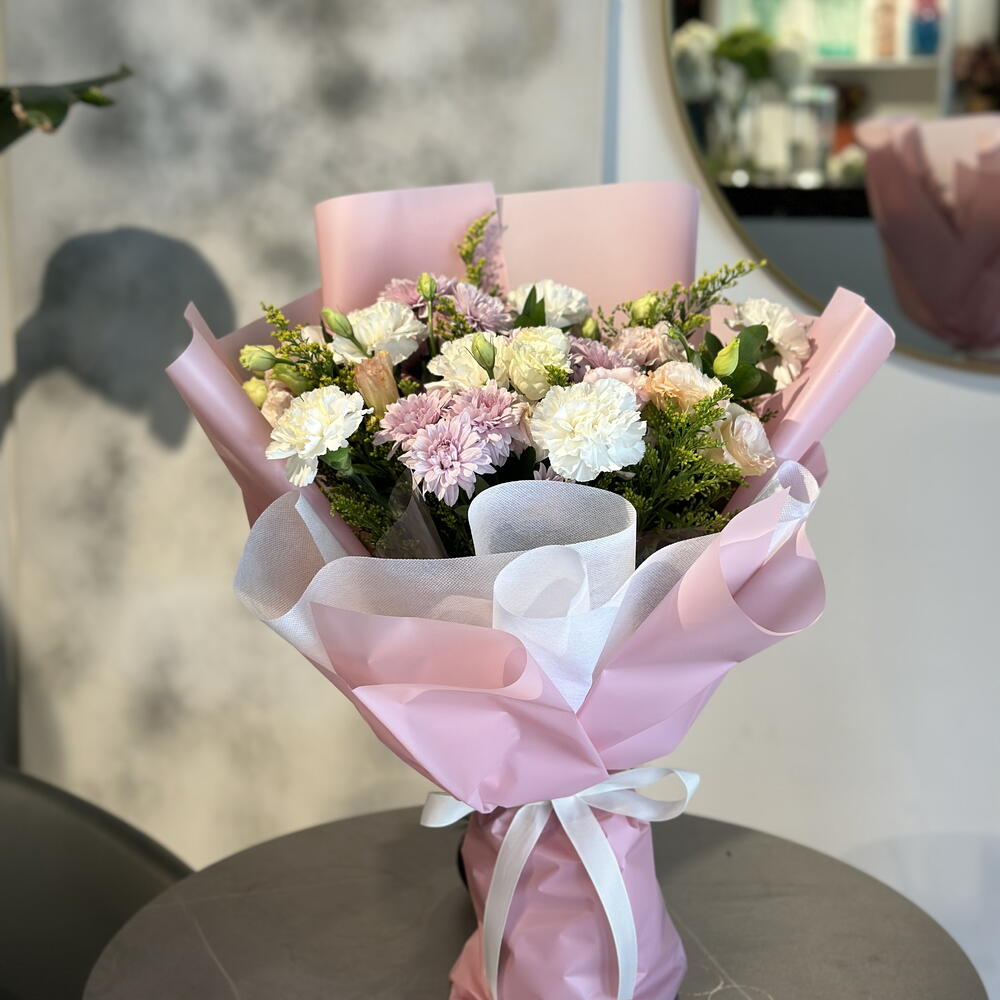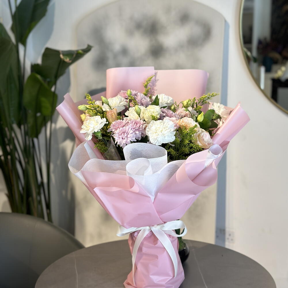 Indulge yourself or your loved ones with this exquisite bundle from our Florists Specials. This arrangement is a splendid symphony of 3 captivating Chrysanthemums, 4 delicate Lisianthuses, 5 charming Carnations, 2 vibrant Gerberas, 3 resplendent Alstroemerias, and 6 sprigs of lively Solidago. The perfect bouquet to brighten up any day and add a touch of elegance to your home decor. Enjoy the charm of fresh flowers that carry the promise of lasting beauty.