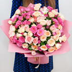 9 Peach Spray Rose, 8 Dark Pink Spray Rose, 8 Light Pink Spray Rose in a pink wrapping.