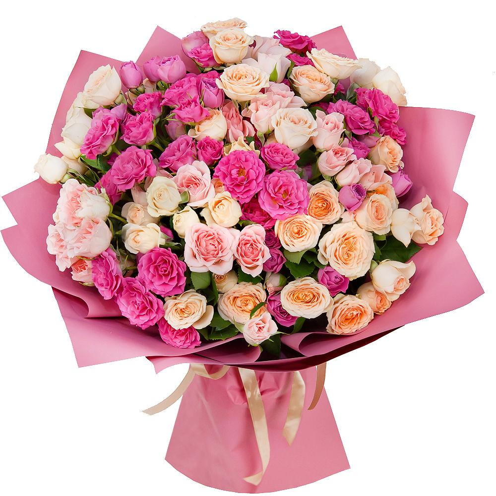9 Peach Spray Rose, 8 Dark Pink Spray Rose, 8 Light Pink Spray Rose in a pink wrapping.