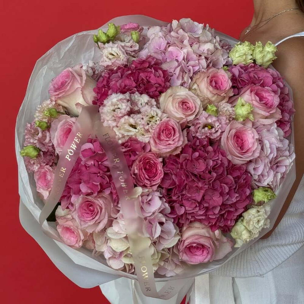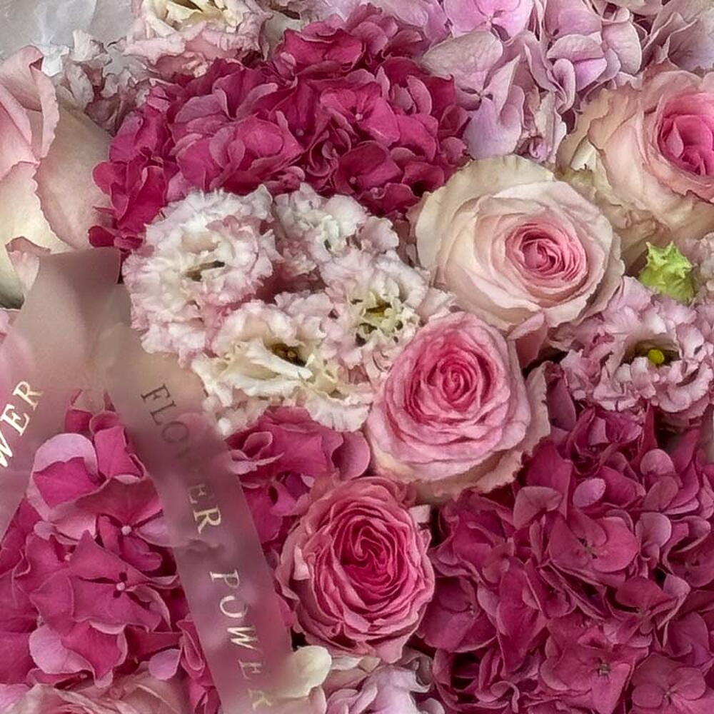 A romantic and elegant symphony of premium pink flowers, featuring lush hydrangeas, roses, and delicate eustomas. This Pink Reverie bouquet radiates tenderness and timeless elegance—a perfect luxurious gift for birthdays, anniversaries, or proposals.