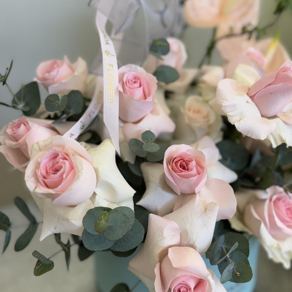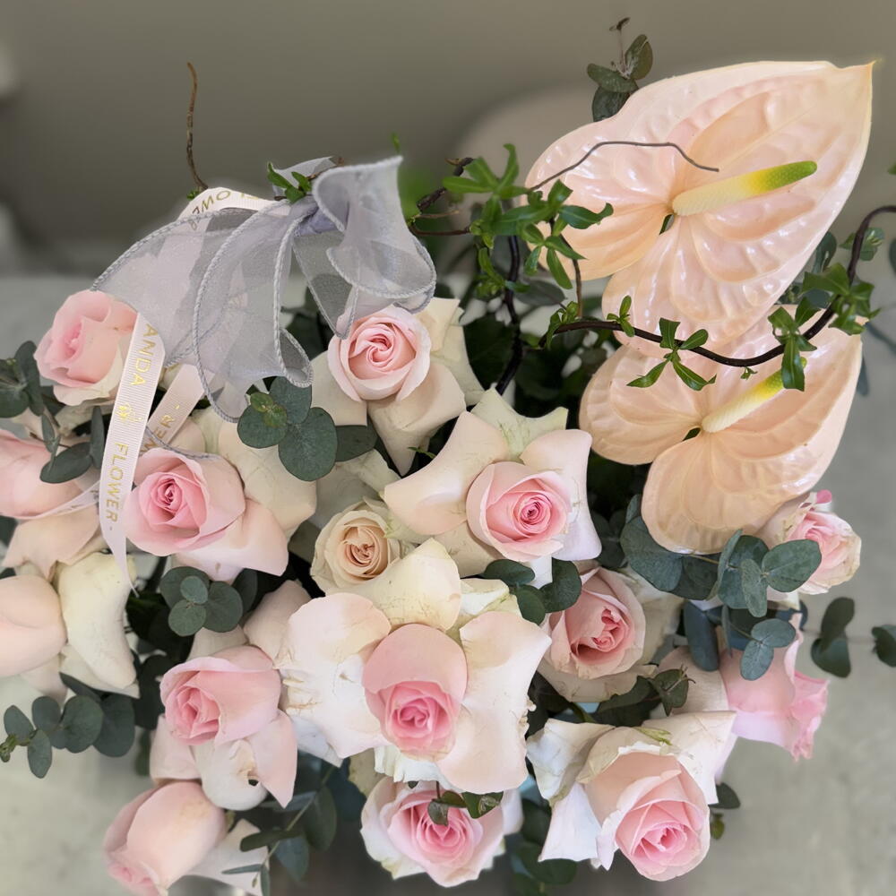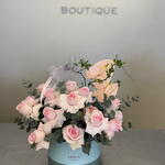 Step into a garden of delight with this exquisite arrangement of premium pink roses. Immaculately gathered together, these 16 roses radiate pure love and affection. Complementing them wonderfully are 4 stems of fresh, fragrant eucalyptus whose scent envelops the atmosphere with a tranquil ambiance. Adding an exotic touch to the collection are 2 gorgeous pink anthuriums which lend an elegant vibrancy to this stunning array. Housed within a chic box, this floral assortment is ready to leave a mesmerizing impression. Perfect for any occasion, these flowers in a box are the ideal way to convey your sentiments.