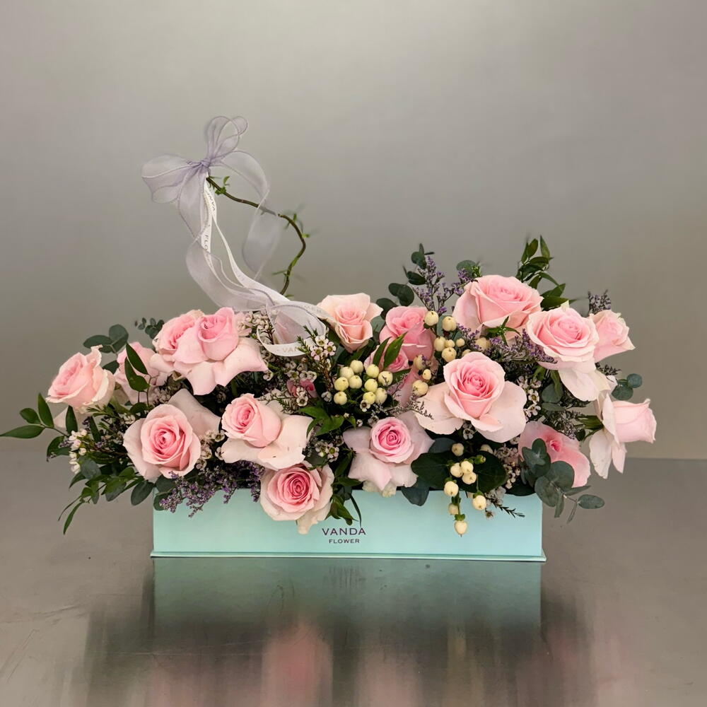 Indulge in the romantic allure of our exquisite Flowers in a Box arrangement. This breathtaking ensemble consists of 15 soft pink roses, lovingly accentuated by delicate touches of 2 pieces of white hypericum. A balancing act of aesthetics, 4 pieces of eucalyptus add a note of sophisticated freshness, completing this artistically curated spectacle. A perfect gift to convey your sentiments or a luxurious treat to enhance your space.