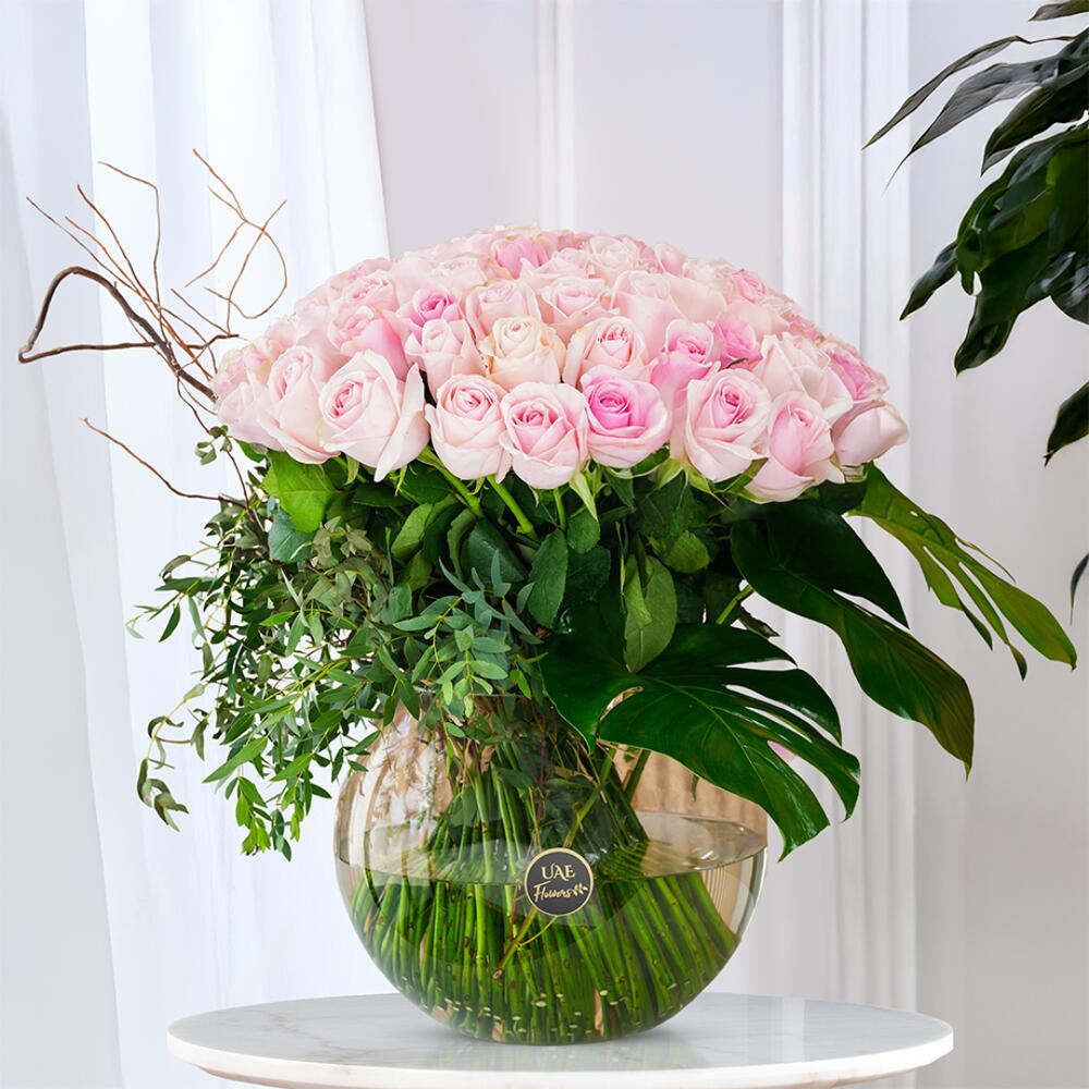 This stunning glass vase arrangement of pastel pink roses is a statement of refined luxury and sophistication. With fresh greens enhancing its natural beauty, it’s the perfect centerpiece for modern spaces, elegant events, or thoughtful gifting.