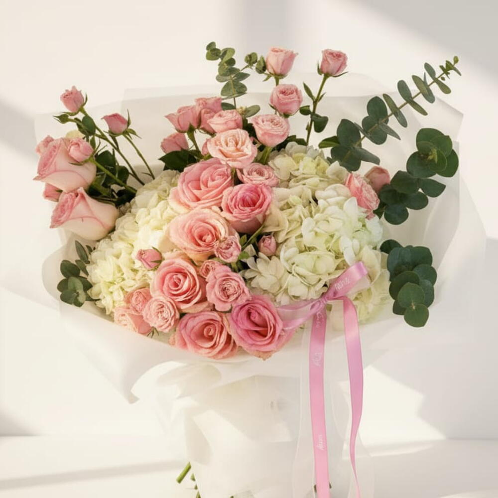 Celebrate Mom with elegance and love with our Pink Rose White Hydrangea Bouquet, featuring 20 beautiful pink roses paired with 2 lush white hydrangeas for a full, luxurious arrangement. Accented with 5 stems of fresh eucalyptus for a natural fragrance and modern greenery touch. A perfect Mother’s Day gift that radiates sophistication, charm, and heartfelt appreciation. 🌸🤍🌿💖