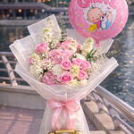 Celebrate the arrival of a precious baby girl with this elegant Pink Roses Hydrangea Bouquet, beautifully paired with a “It’s a Girl” balloon and Ferrero Rocher chocolates. This premium arrangement features fresh pink roses, soft hydrangeas, delicate white seasonal blooms, and lush greenery, artistically wrapped in luxury translucent paper and finished with a soft pink satin ribbon. The baby girl helium balloon adds a joyful celebratory touch, while Ferrero Rocher chocolates complete the gift with sweetness and elegance.
