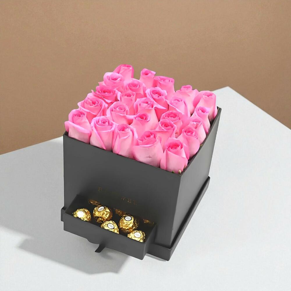 Experience the ultimate luxury with this unique Flower Box. Inside, youll discover 25 exquisitely arranged pink roses, swathed in a fresh elegance that will take your breath away. To sweeten the surprise, the arrangement is paired with 8 pieces of finest chocolate, adding a rich, decadent touch. All presented in a sleek black box, making it a perfect gift for any special occasion - from romantic gestures to birthday surprises. Leave lasting memories with this statement piece!