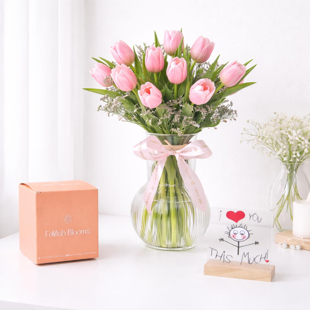 This elegant floral gift from FaVish Blooms beautifully combines soft blooms with a delightful sweet touch. The arrangement features 11 fresh pink tulips, complemented by delicate limonium, and styled in a clear glass vase tied with a soft pink ribbon for a graceful and romantic finish. Presented with a charming “I Love You” tabletop topper, this set also includes 250 grams of premium dragees in a signature FaVish Blooms gift box, making it a perfect gift to celebrate love and special moments. Whether for anniversaries, romantic surprises, or simply to express heartfelt emotions, this charming floral and sweet combination is sure to leave a lasting impression. Includes:- 11 Pink Tulips 3 Stems Limonium Glass Vase with Pink Ribbon “I Love You” Table Topper 250g Premium Dragees Arranged in a FaVish Blooms Gift Box.