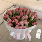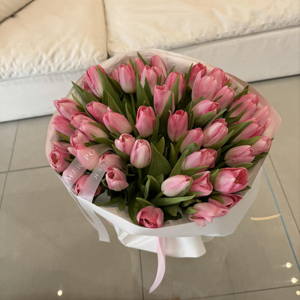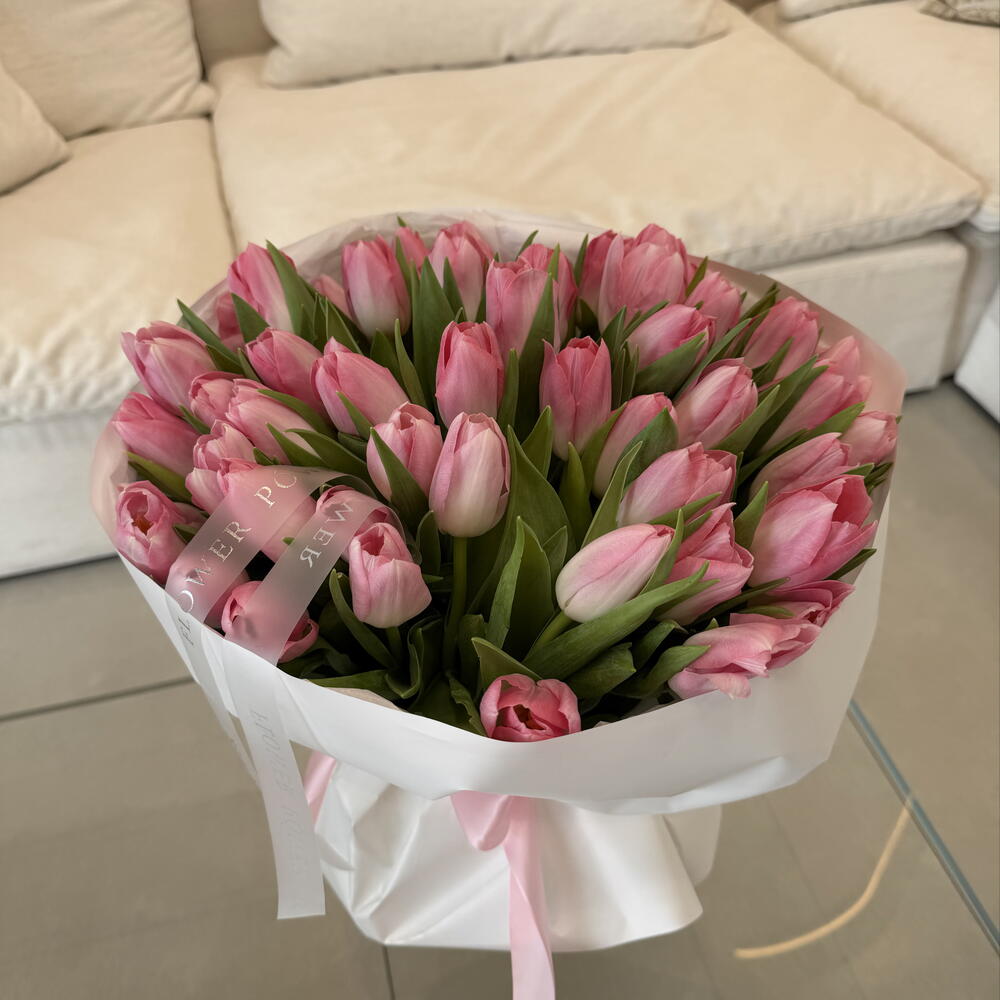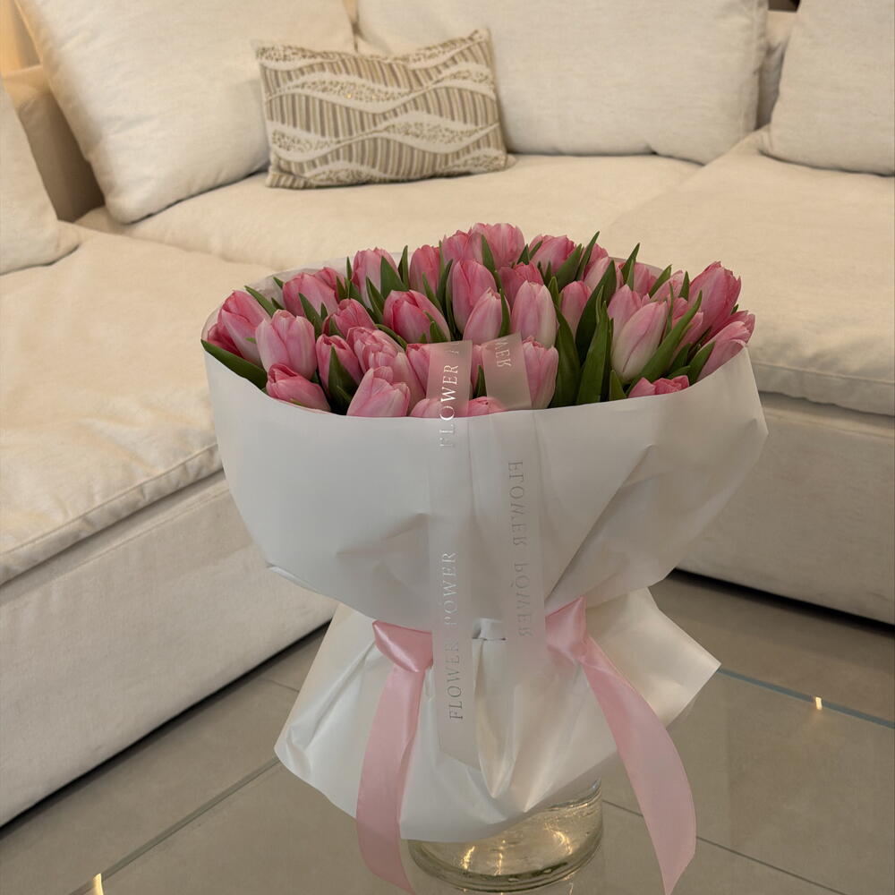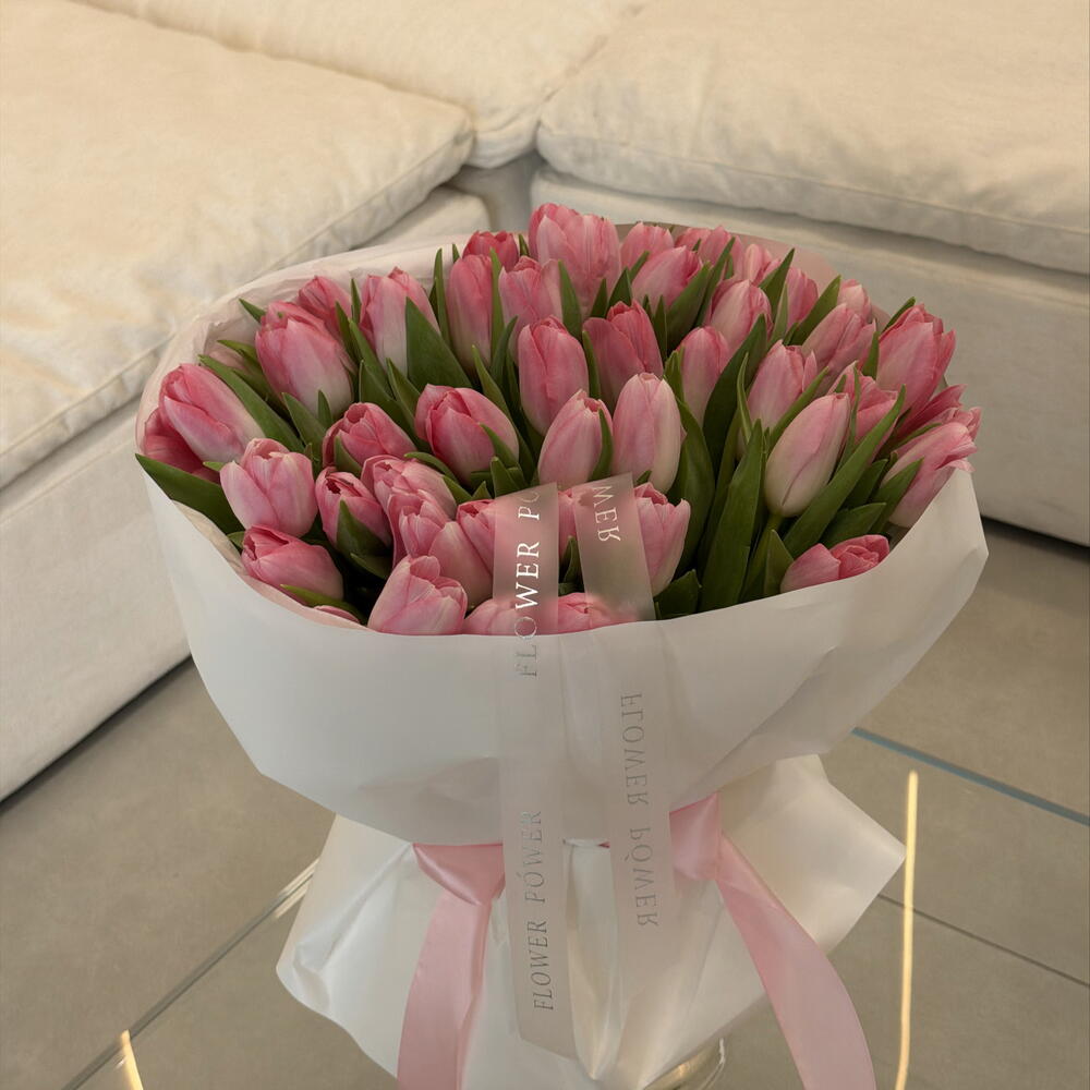 A classic bouquet of 50 fresh tulips — elegant, stylish, and always appropriate. Tulips are known for their delicate shape, smooth stems, and graceful silhouette, creating a light and refined floral arrangement.