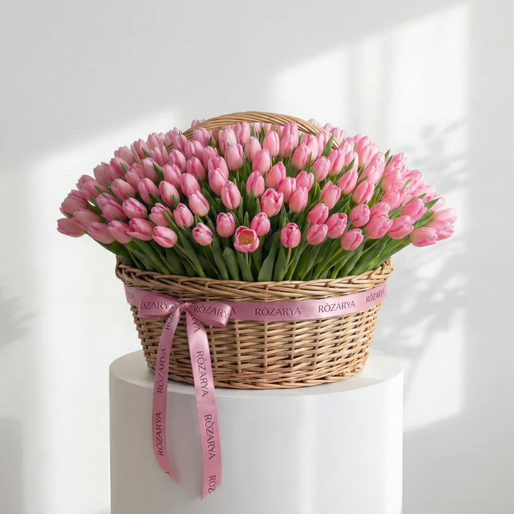 A grand architectural statement featuring 201 premium red tulips. Presented in a luxury natural wicker basket with our signature white branded ribbon. The ultimate expression of bold passion and modern floral luxury. • Please Note: As flowers are natural products, actual colors may vary slightly from digital images due to seasonal growth and lighting conditions. We guarantee that the overall style and premium quality as well as freshness of your arrangement will always be maintained.