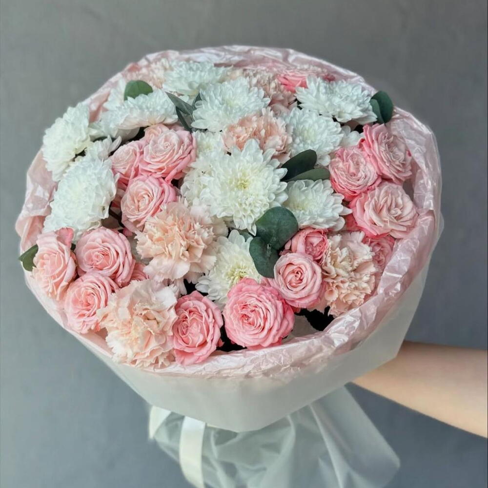 Chrysanthemum white - 3 pcs carnation pink - 5 pcs wrapping paper - 3 pcs bombastic pink - 5 pcs