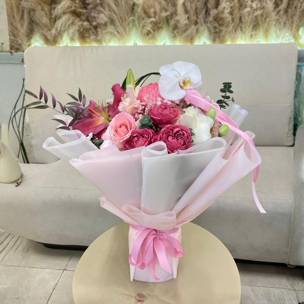 Express love and elegance this Valentine’s Day with a delightful bouquet featuring Julieta pink roses, pink lily, white deco roses, white lisianthus, Phalaenopsis orchid, and fresh steelgrass accents. This thoughtfully designed arrangement blends soft pink and white tones for a romantic and graceful presentation.