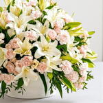 A graceful arrangement featuring 15 elegant white lilies, 20 delicate light pink carnations, and 10 charming pink spray roses, beautifully styled with lush green fillers. Presented in a chic round box, this design blends purity, softness, and timeless romance — making it an exquisite gift for birthdays, anniversaries, heartfelt apologies, or any special moment that deserves elegance and warmth. Send pure elegance today — order RC-B842 and surprise your loved one with a box full of beauty, love, and gentle charm.