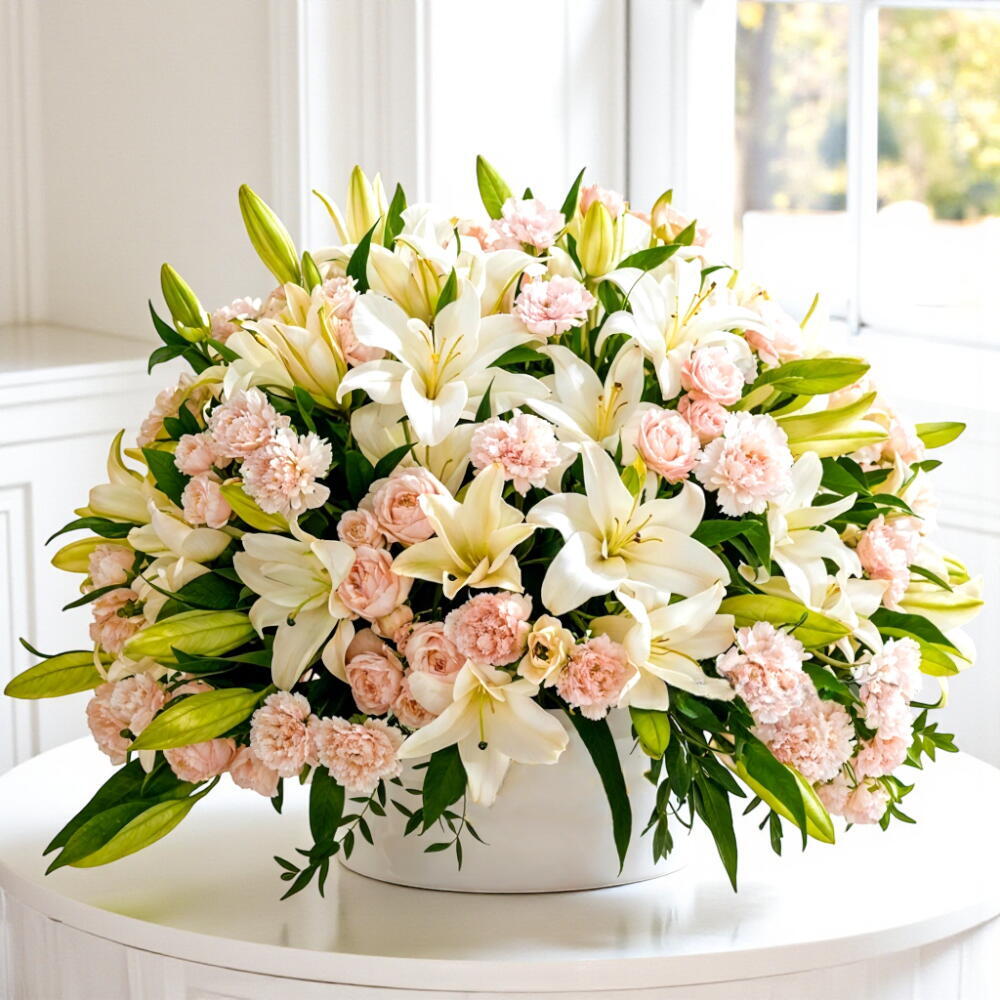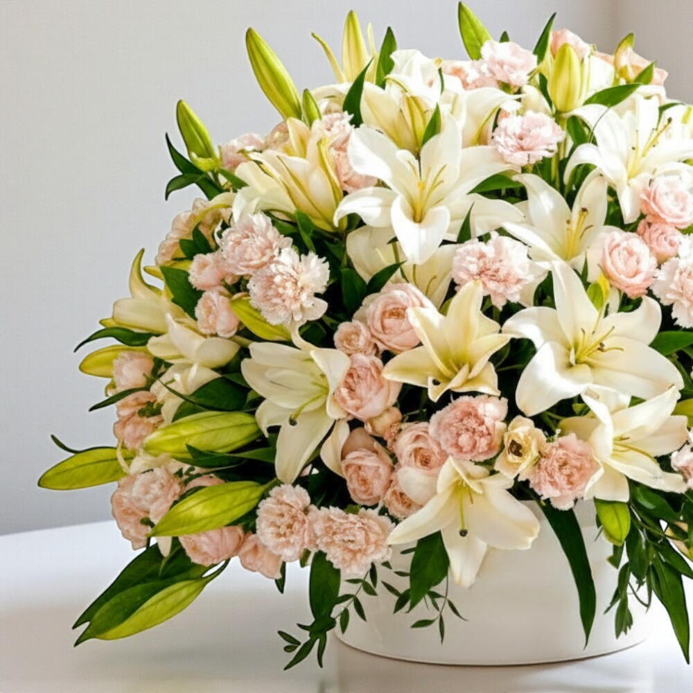 A graceful arrangement featuring 15 elegant white lilies, 20 delicate light pink carnations, and 10 charming pink spray roses, beautifully styled with lush green fillers. Presented in a chic round box, this design blends purity, softness, and timeless romance — making it an exquisite gift for birthdays, anniversaries, heartfelt apologies, or any special moment that deserves elegance and warmth. Send pure elegance today — order RC-B842 and surprise your loved one with a box full of beauty, love, and gentle charm.