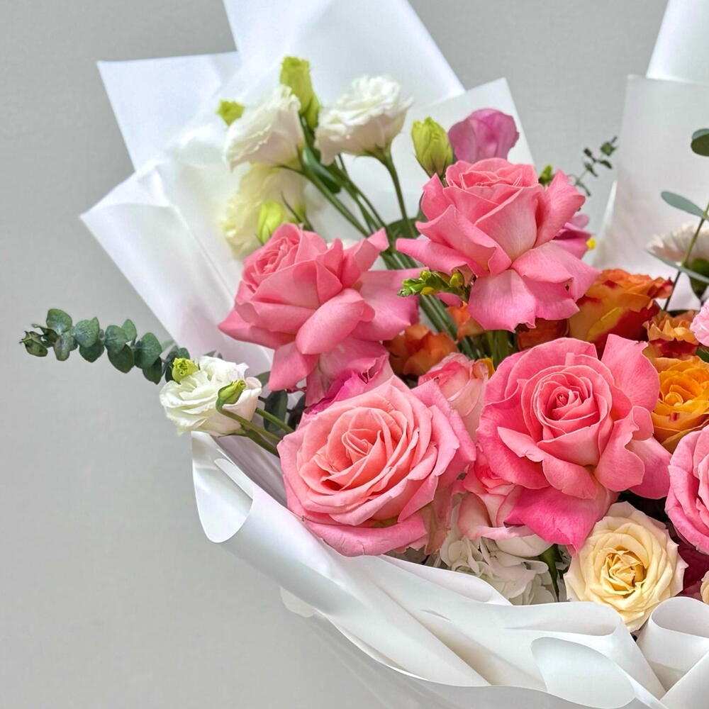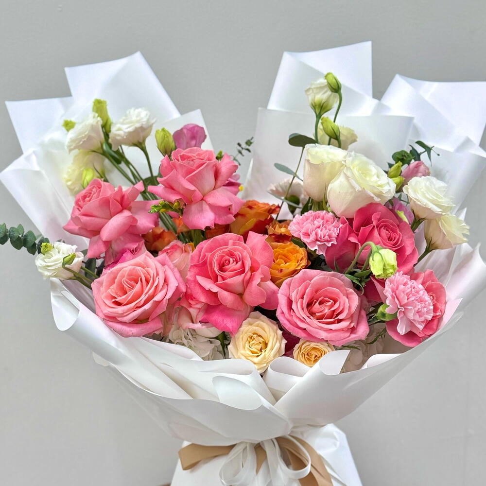 Eucalyptus - 6 pcs White rose - 4 pcs carnation pink - 4 pcs hydrangea white - 2 pcs lisianthus white - 4 pcs yellow spray rose - 3 pcs confidential rose - 4 pcs hermosa rose pink - 7 pcs