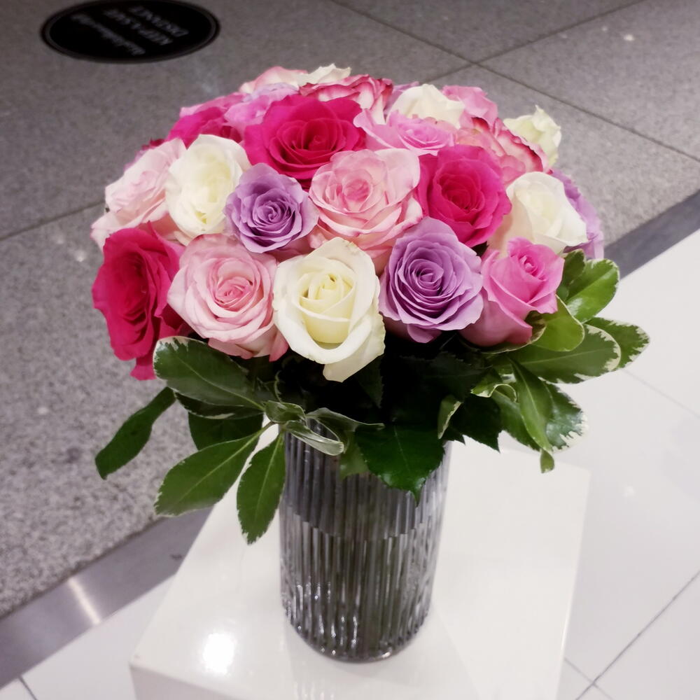 25 Pink White Roses Beautifully Arranged in a Glass Vase. Enjoy Free delivery across Dubai Sharjah.