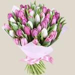 A stunning hand-tied bouquet featuring 15 white tulips, 15 purple tulips and 15 pink tulips, elegantly wrapped in soft pink paper and tied with a matching ribbon bow. This vibrant arrangement makes a perfect gift for birthdays, anniversaries, Mothers Day, or to express love and appreciation. Bright, elegant and full of charm, a true symbol of grace and affection