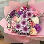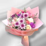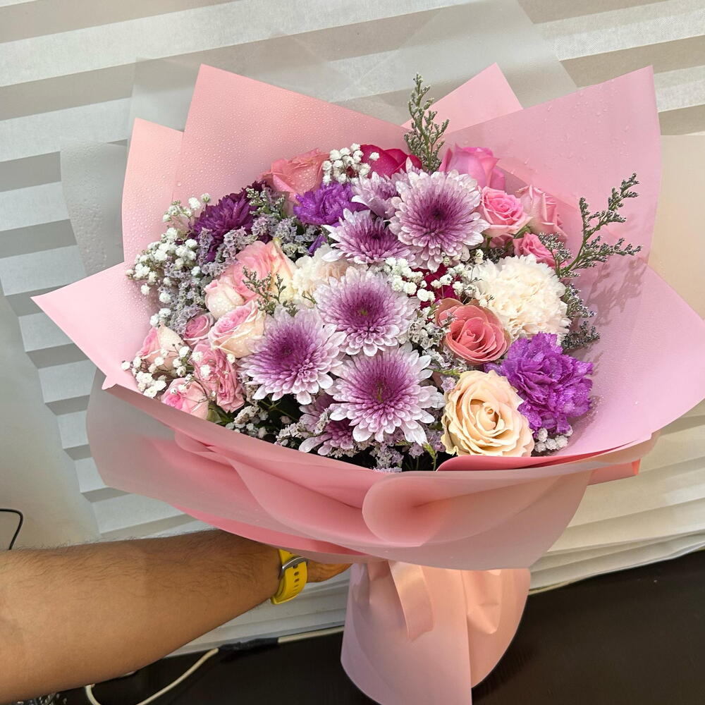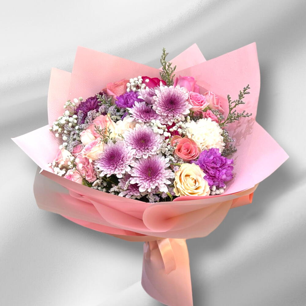 Delight in the elegance of our Mono Bouquet, meticulously curated to embody an air of sophistication. Its composed of 3 tender Chrysanthemums, 10 stunningly vibrant pink mixed color roses, and accentuated by 2 lush Babroses. A perfectly enchanting floral expression of style and grace, designed to bring beauty to any space.