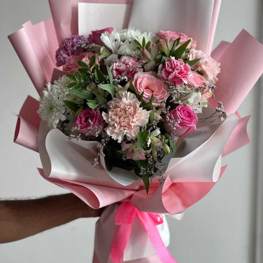 Pink rose - 7 pcs pink alstroemeria - 4 pcs pink carnation - 6 pcs white chresanthemum - 2 pcs
